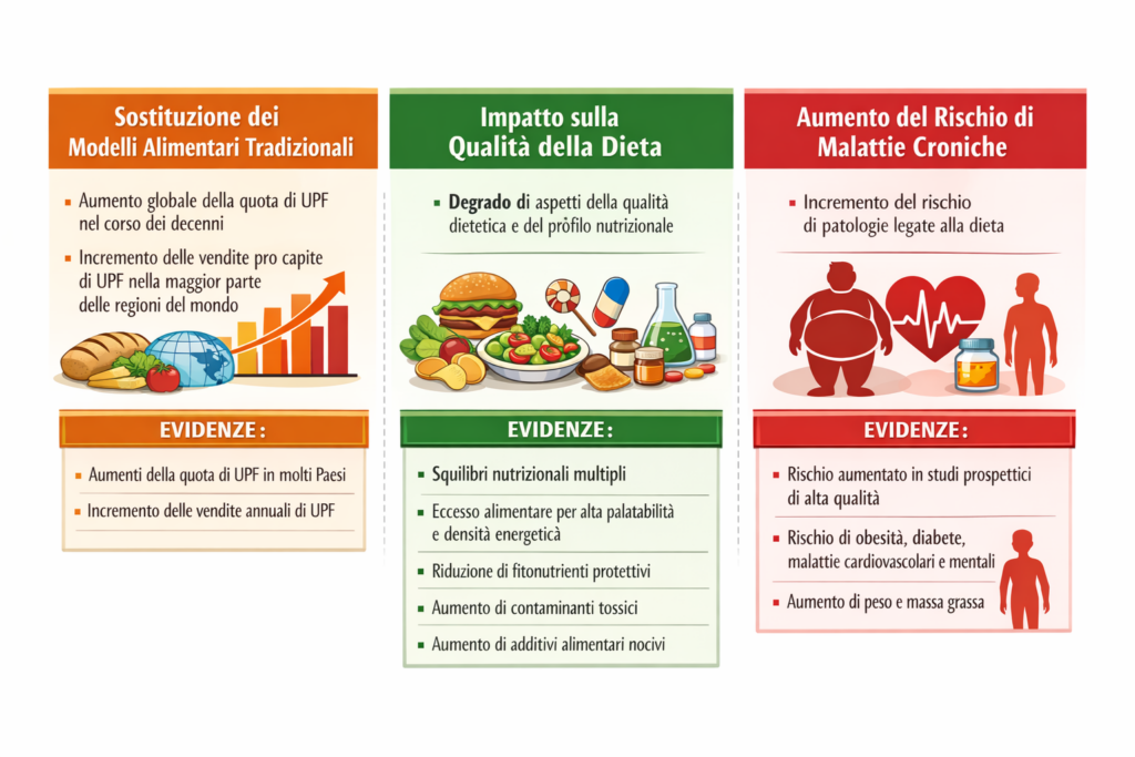 Pertanto, l’insieme delle evidenze relative alle tre ipotesi supporta la tesi secondo cui la sostituzione dei modelli alimentari tradizionali di lunga data con alimenti ultra-processati rappresenta un determinante chiave dell’aumento globale del carico di molteplici malattie croniche correlate alla dieta (figura 1).