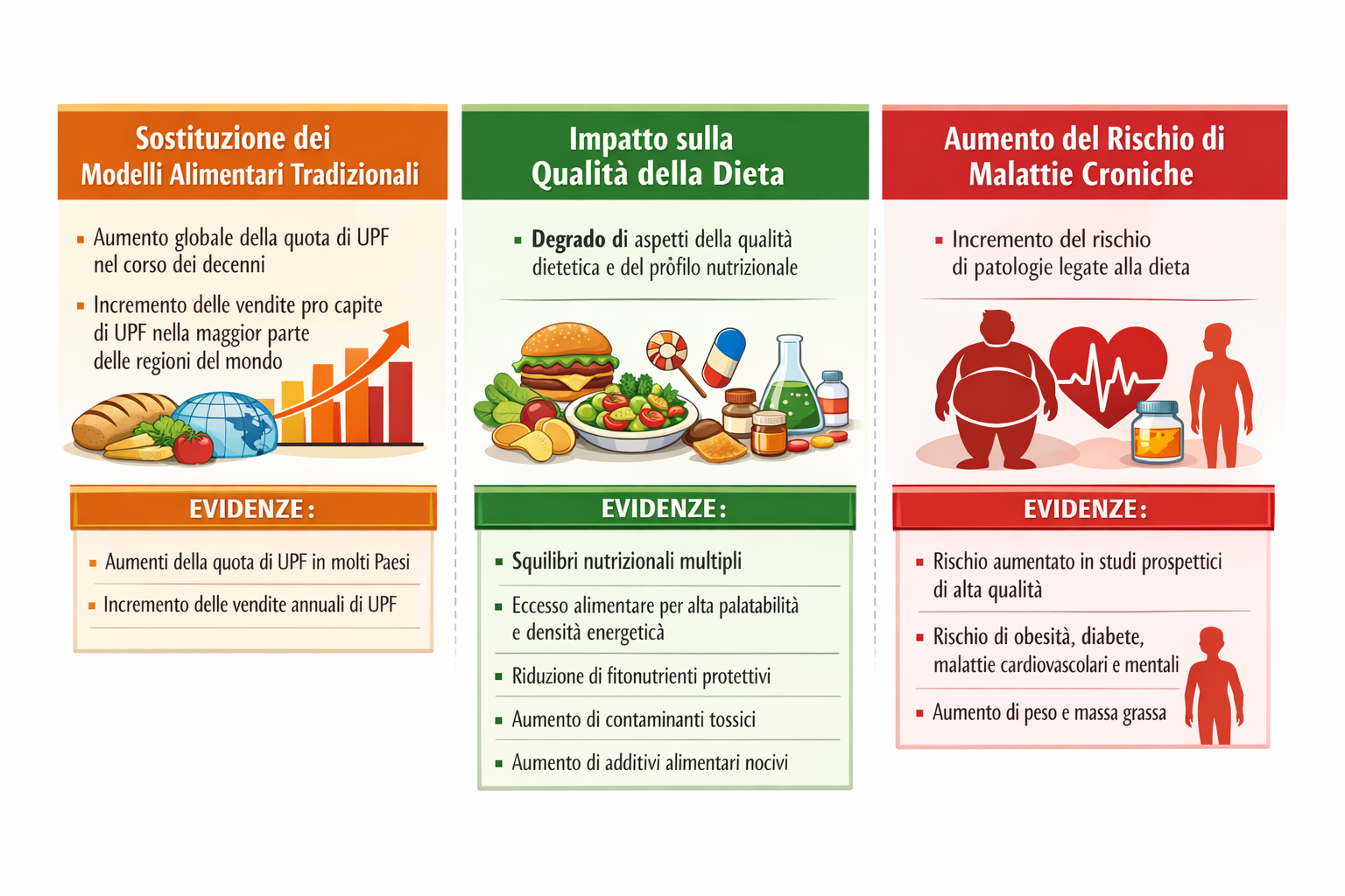 Figura 1: Tre ipotesi alla base della tesi secondo cui la sostituzione dei modelli alimentari consolidati da parte degli alimenti ultra-processati (UPF) rappresenta un fattore chiave dell’aumento globale del carico di numerose malattie croniche correlate alla dieta.